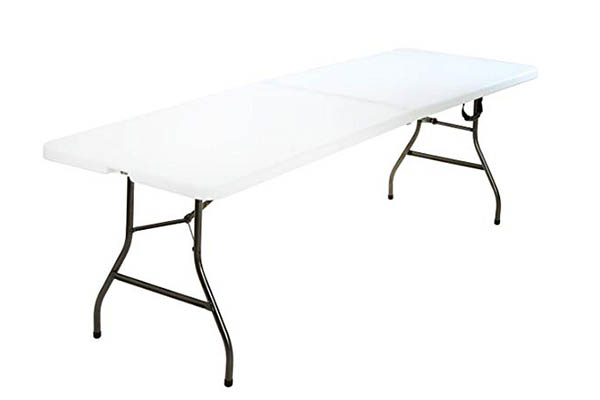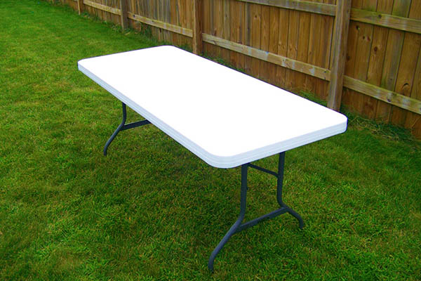 White plastic folding table. Secure Lock keeps the table closed when transporting. Comfort handle makes it comfortable to carry when folded and locked. All season table for both indoor and outdoor use.